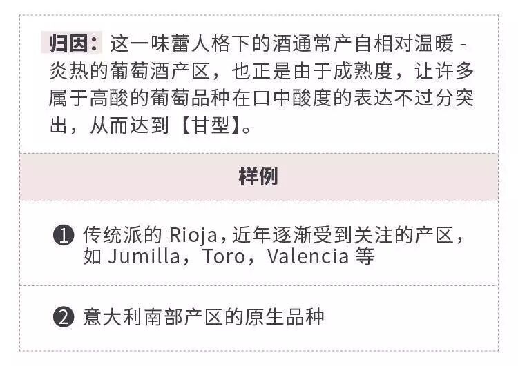 在之前的葡萄酒体系中,我们基本找不到“甘”这样一个形容字眼,更多见到的是新世界风格、浓郁甜美的果味等等。其实这些说的就是“甘型”这么一回事儿,它就特指那些并非因为残糖,而是充沛的果味带来的甜感。当然,这样的酒在酸度上不能过于出挑,如果其他因素盖不住一款酒中“突兀”的酸,那么它可能更适合被归类为酸型。