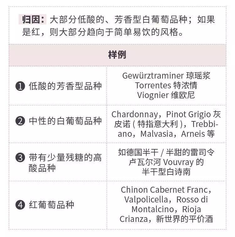 最后的甜香其实很好理解啦,对于一款白来说,除非它具有明显的矿物质感会被归类为咸香类之外,其他情况下,还是甜香型才更讨喜,毕竟你也不希望老从一款白葡萄酒中找到蘑菇味吧?而如特浓情这样的芳香品种,那么它自然是极大的偏向花果香型;如果这是个中性的葡萄品种,酿酒师也希望它能通过酿造手法去影响这个“没个性”的家伙,让它变的甜美可人一些。所以说,甘轻透甜,也算是个相辅相成的关系吧。