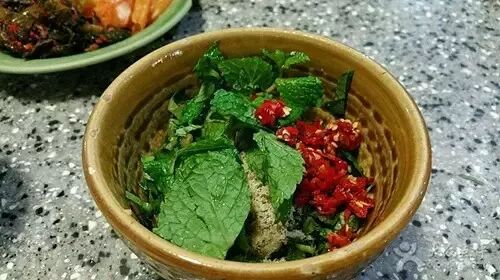薄荷自带清凉清爽的属性,与肉类荤菜搭配可不止一种,比如薄荷牛汤锅就正是要在最热的火把节吃才过瘾! 将牛肉筋头巴脑煮一锅,熬烂熬入味,浓浓的连汤带肉盛起一碗,盖上一大撮薄荷,最上面再撒上大量花椒面辣椒面,用筷子翻个面,各人捞一碗大吃特吃,吃出一头一脸的汗只觉得舒服,这样的夏日美食,有机会牛也不妨一试。