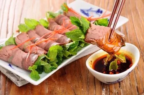 牛肉煮熟切凉片,一片凉片一片薄荷叶卷起来,浇上辣油料汁吃,也是非常不错的荤凉菜,自己不会煮牛肉,到超市买现成的卤牛肉也行,回来切片,加点薄荷,又是一种新口味。