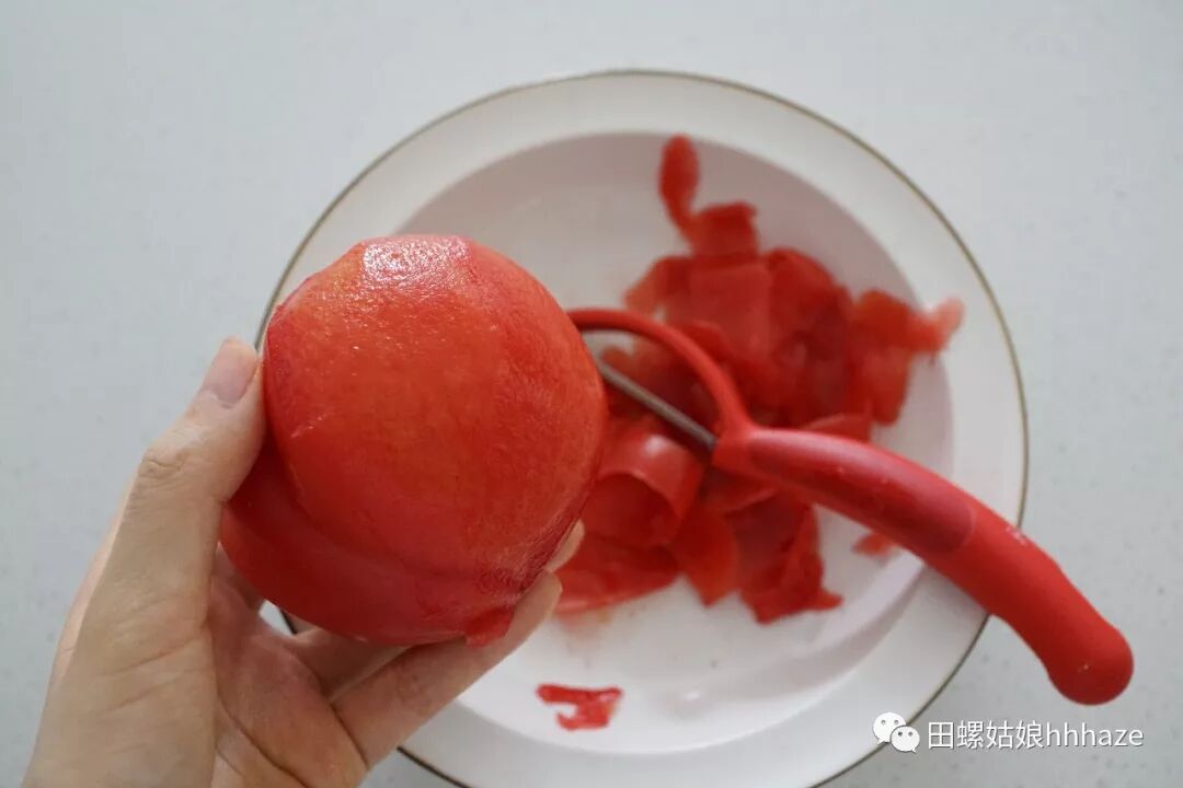 番茄去皮有两个方法:切十字形在沸水里烫一下、撕掉表皮也可以,用图片上这种软质削皮刀也可以。