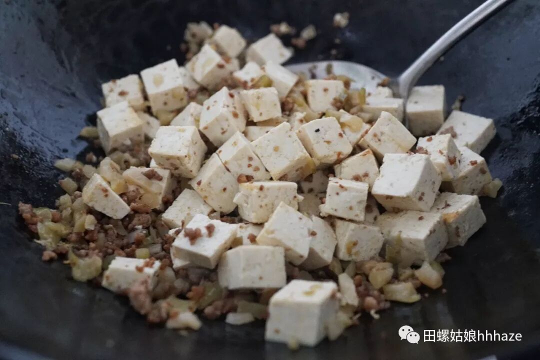 转大火,豆腐丁入锅快速翻炒十几下。炒豆腐的时候锅铲从整锅菜的底部铲、拌,就不容易碎。