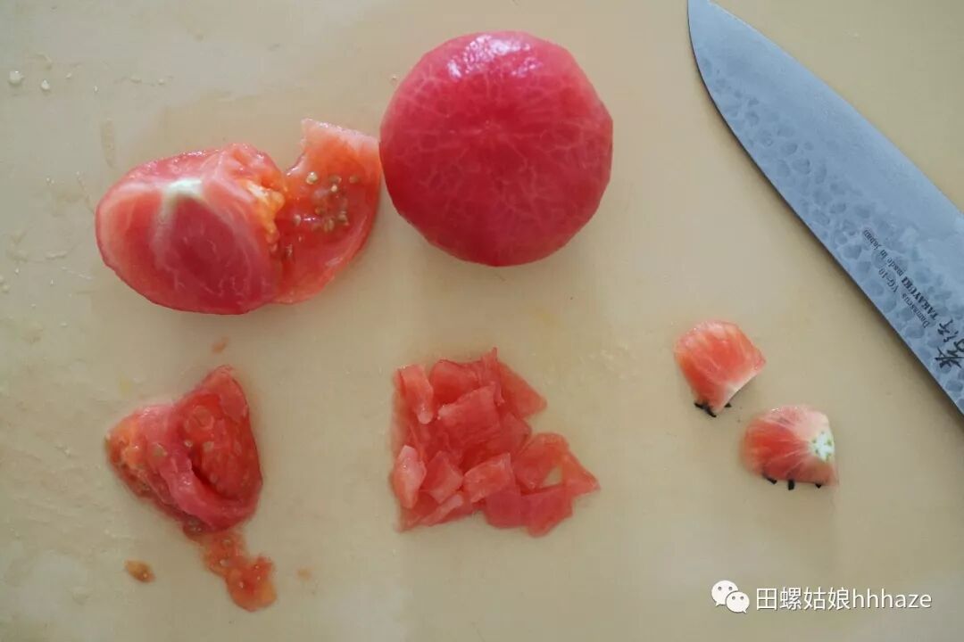 番茄切丁的时候,因为不想有太多汁水和同样出于口感的考虑,我也会抛弃掉有籽的那部分。但这个看你喜好,汁水多也挺好吃的。