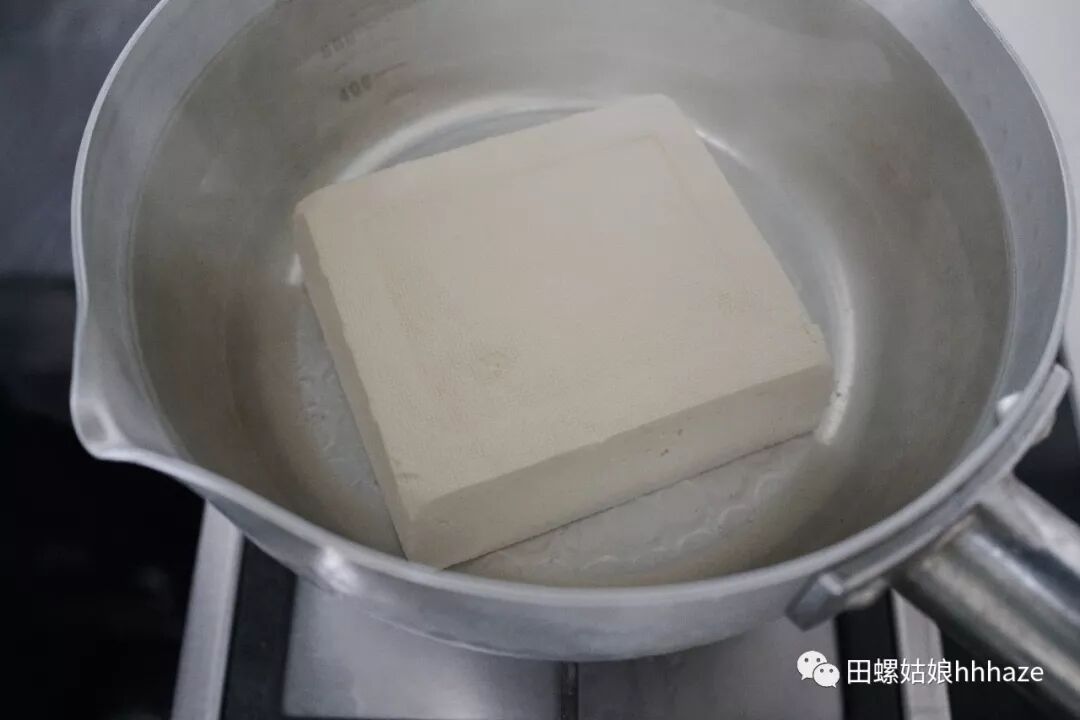 烧沸一锅水,里面加一勺盐(原料分量外)。关火把豆腐放到盐水里浸泡几分钟,略入入味,等其他原料处理完之后就可以把豆腐切丁准备入锅了。
