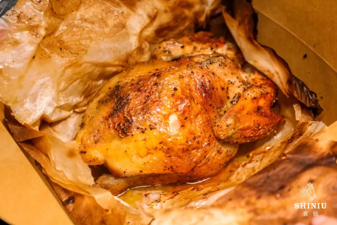 温柔撕开被烤焦的002超薄纸张,鸡是意外的多汁,盒底的汁水泛着金灿灿的光。