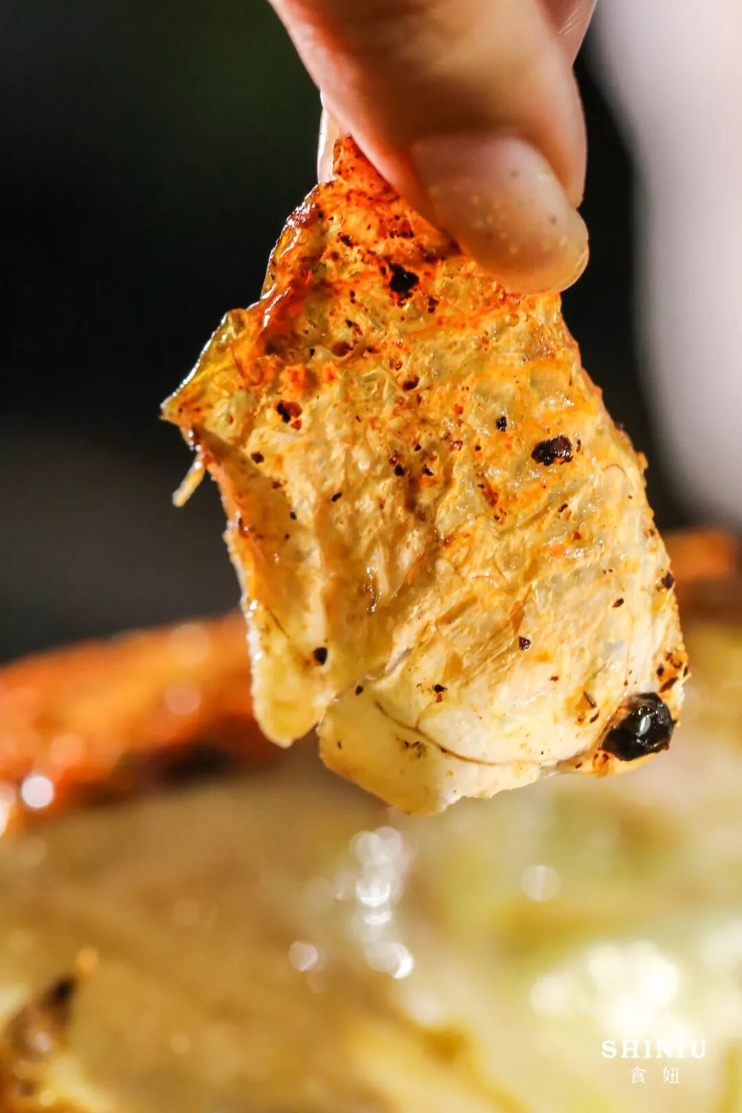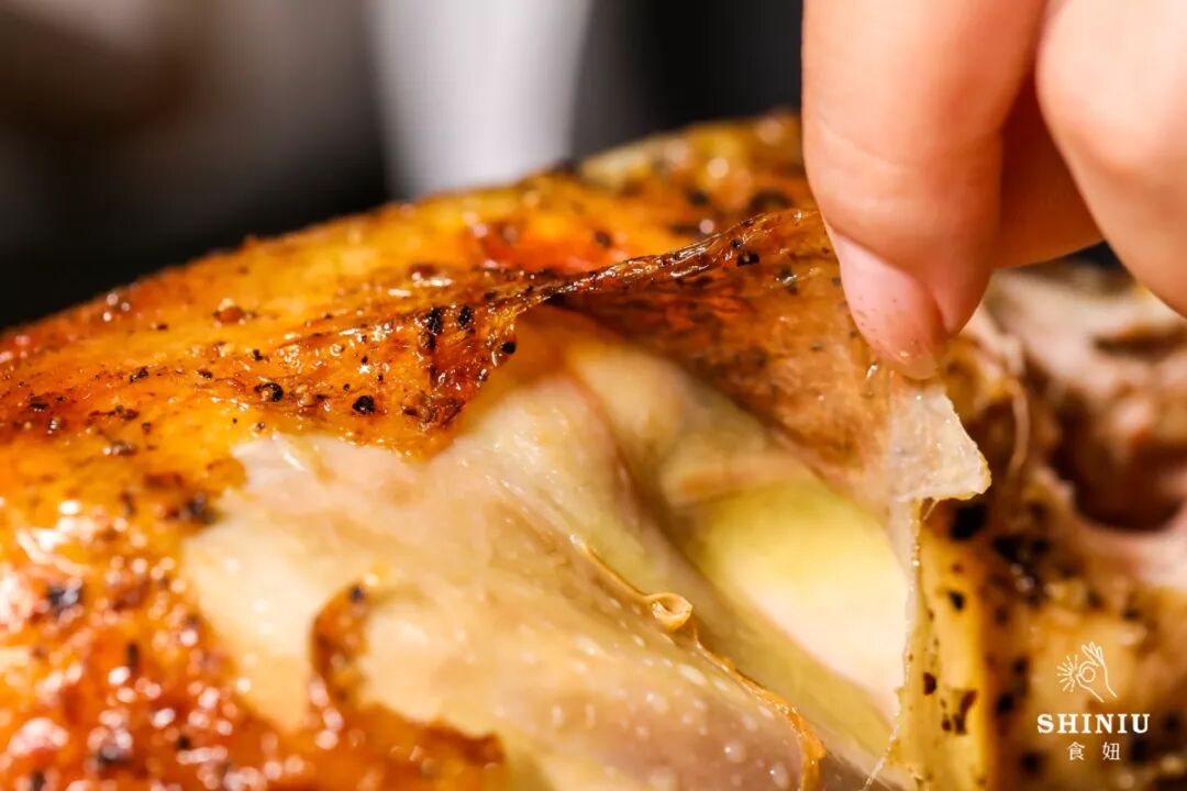 鸡皮在高温烤制后,鸡油浓缩在了皮上,变得又薄又脆,与黑胡椒紧紧黏连,光吃鸡皮,都觉得油脂四溢,香辣爽口!