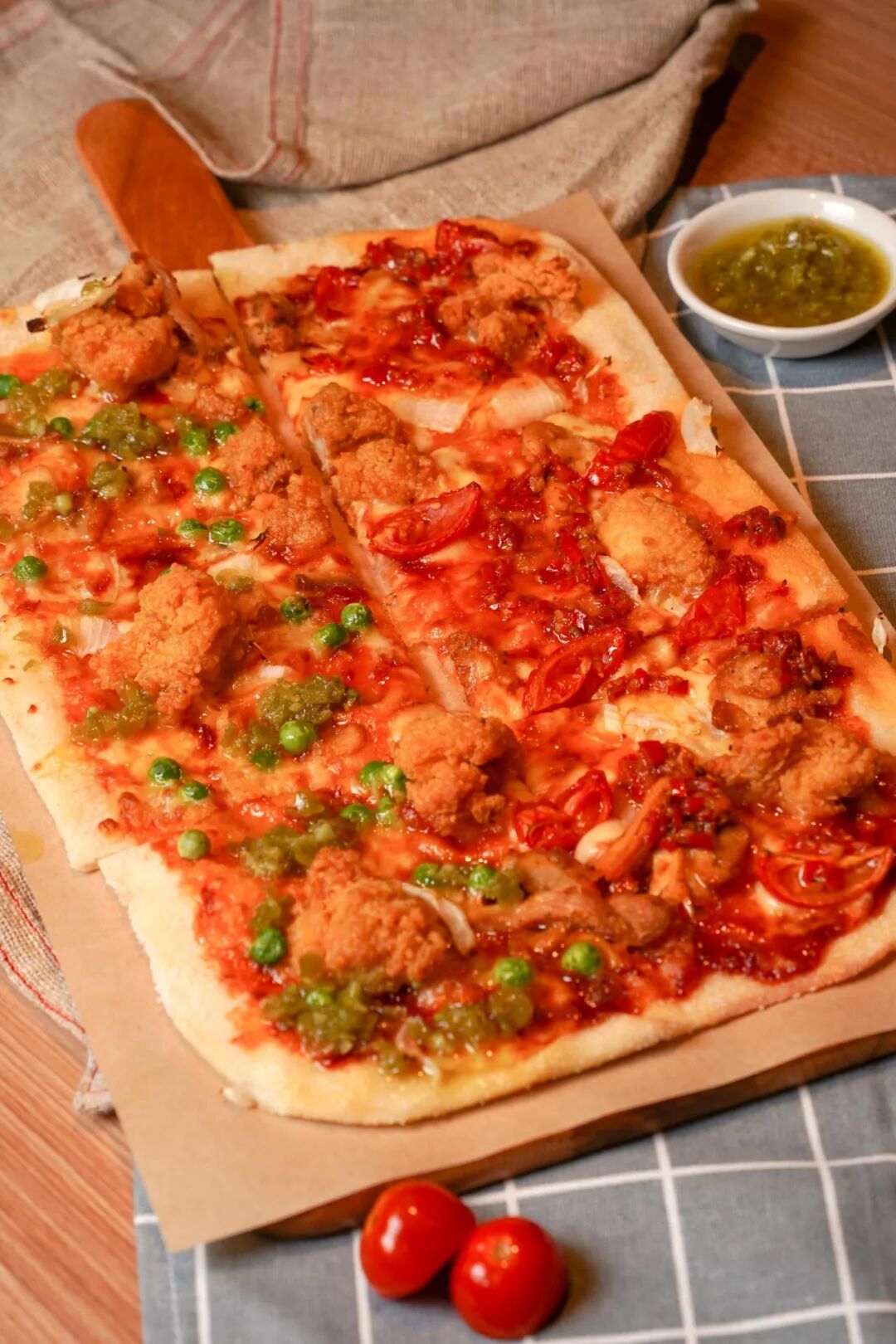 - 湘菜碰上比萨会是什么样?喏,这个就是了~复刻湘菜精髓的盛世双椒鸡肉比萨,红剁椒和绿酱椒铺满饼底,看着就能感受到热辣袭来。 百年古法技艺酿造的剁椒酱,红剁椒油润鲜香,绿酱椒热辣深邃,这个辣度不会过于