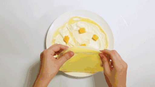 11. 将奶油均匀涂抹在煎好的班戟皮上,再放上几粒芒果块