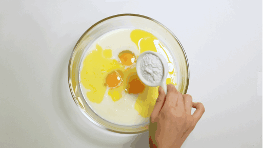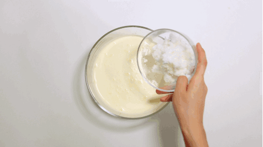 3. 接着碗中倒入360克牛奶、20克融化的黄油、45克糖粉搅拌均匀