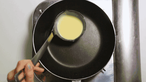 7. 接着将面糊倒入平底锅中迅速摊匀,小火煎至起泡,做成班戟皮备用