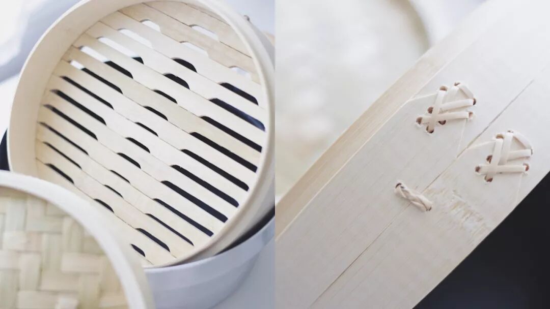 再来看看另一个主角——蒸笼。蒸笼的材质是杉木,蒸制食物时会散发出木头特有的清香,蒸笼盖子是手工编制的,蒸格侧边采用木钉加固,坚固耐用又十分古朴上镜。