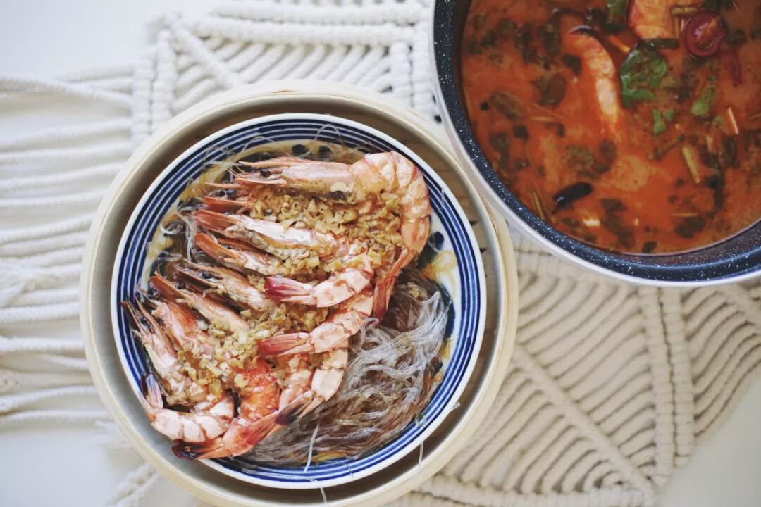 比如图里的蒜蓉粉丝蒸虾和冬阴功汤组成的黑虎虾两吃,就是用这口锅同时做出来的一顿丰盛又快手的晚餐。