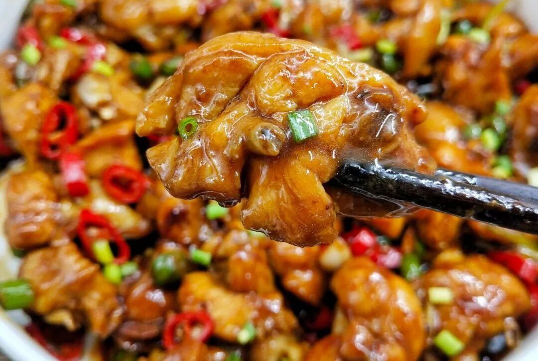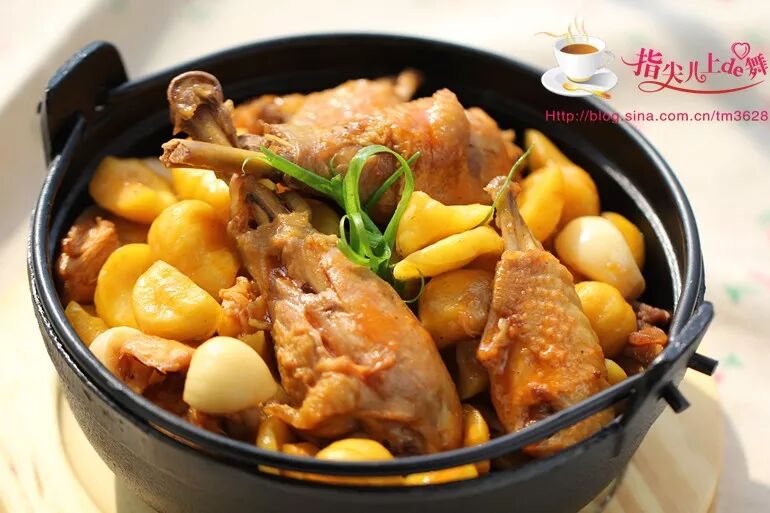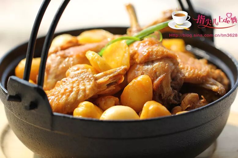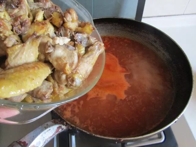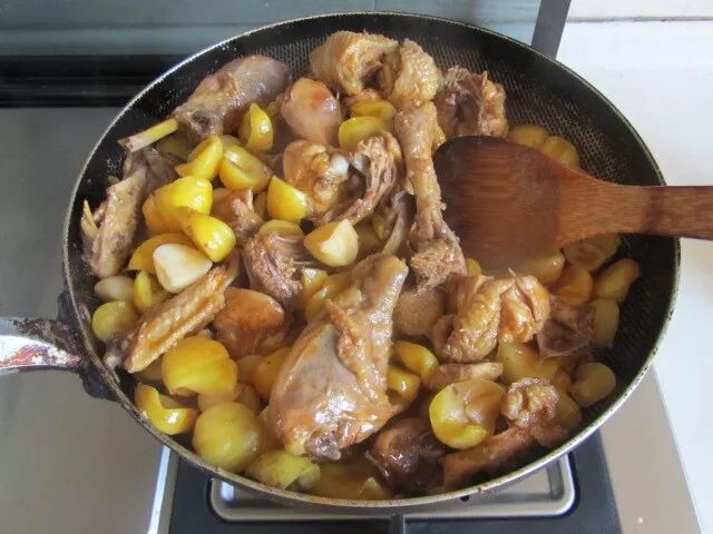 9. 下入煸炒过的鸡肉(记得不要将油脂倒入)。