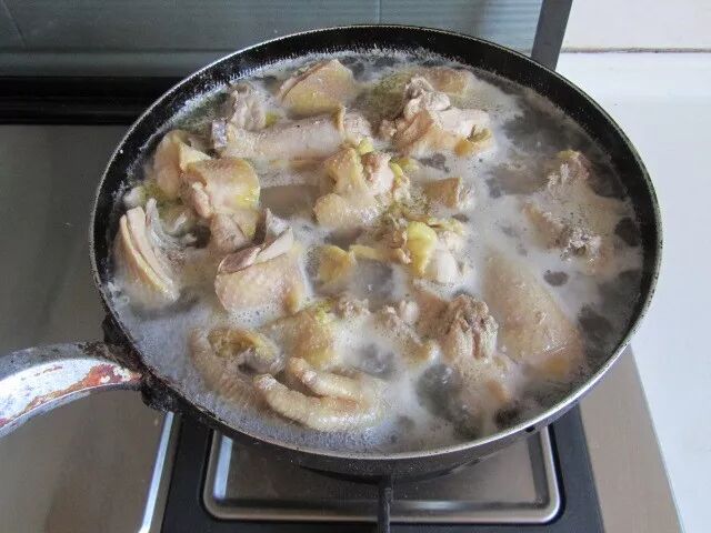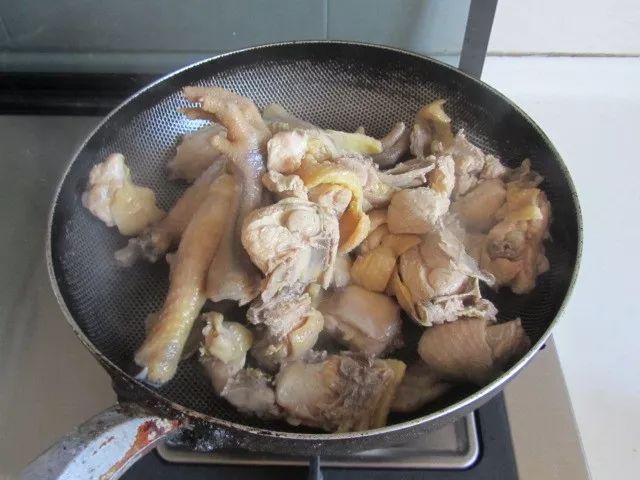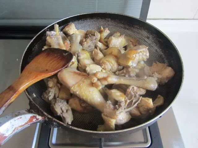 4. 将鸡中的水分煸干,表面微微发黄, 连同煸炒出来的油和鸡肉一起盛出备用。