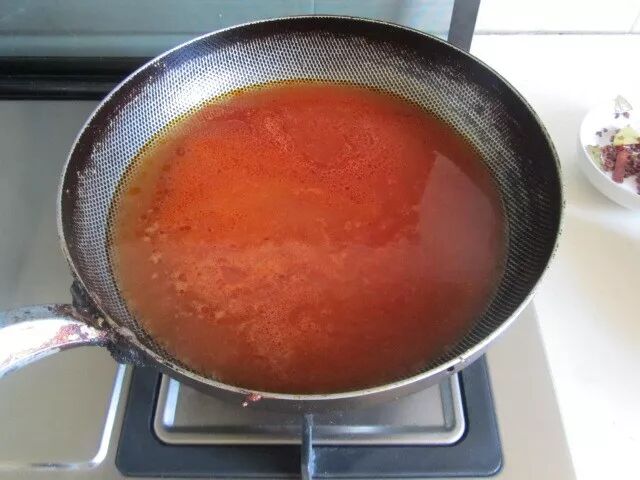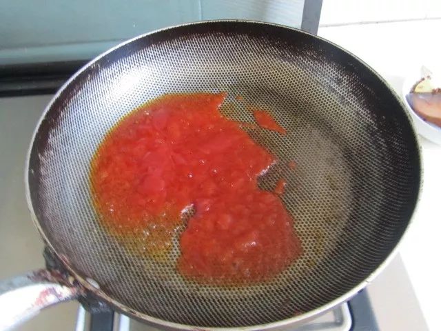 7. 煸炒过大料的油下入番茄酱一起翻炒。