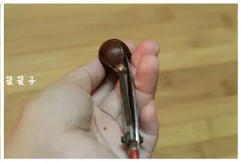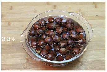 3.【筷子搅拌法】:将栗子一切两瓣,放入盆内,加开水浸泡一会儿后,用筷子搅拌,栗子的皮就会与栗肉脱离。浸泡时间不能过长,否则将会影响栗子营养成分。