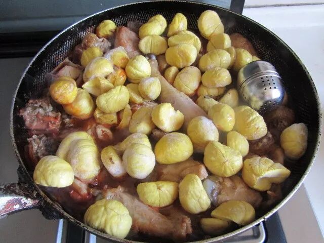 10.再放入板栗和调味料钢球,(如果汤汁没有淹没过原料可以适量加点开水),大火烧开小火焖20分钟后放入大蒜, 再依据个人口味加入盐调味。
