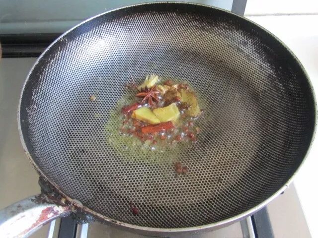 5.剩余些底油,下入姜片、花椒、八角油等煸炒。