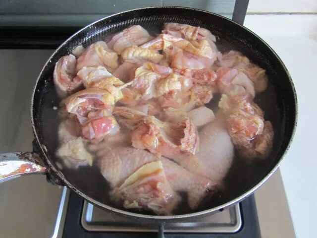 3. 锅中放入适量的油, 下入焯过水的鸡肉煸炒。