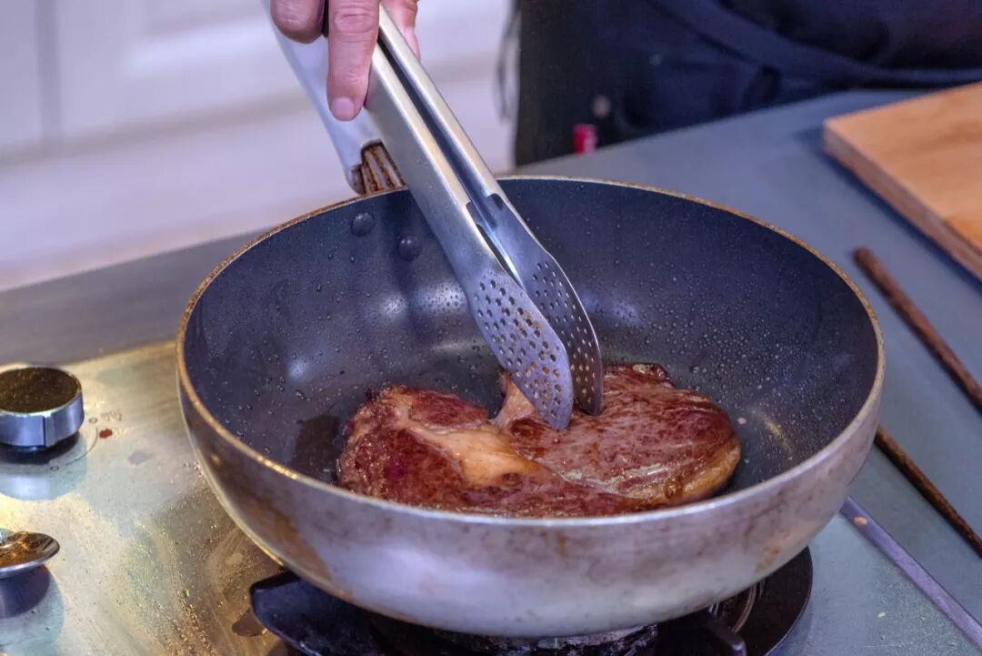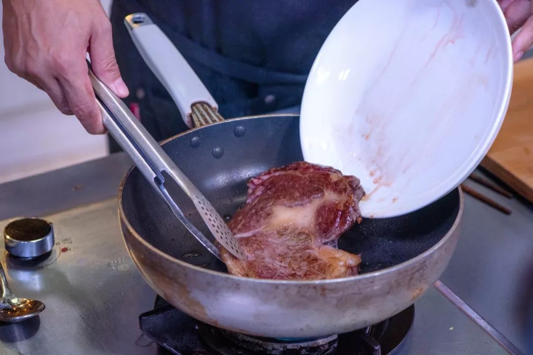牛排再放到锅中煎,煎一分钟后拿出来静置一分钟,让血水凝固。