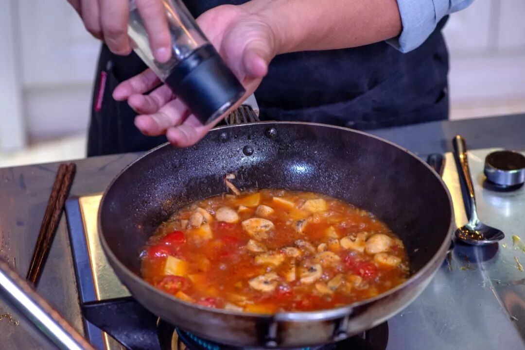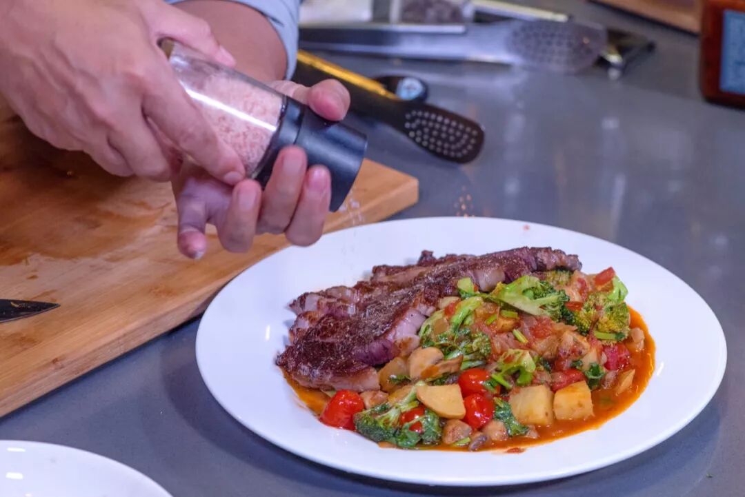 撒上黑胡椒、盐巴,完成这一道酸辣香煎肋排。