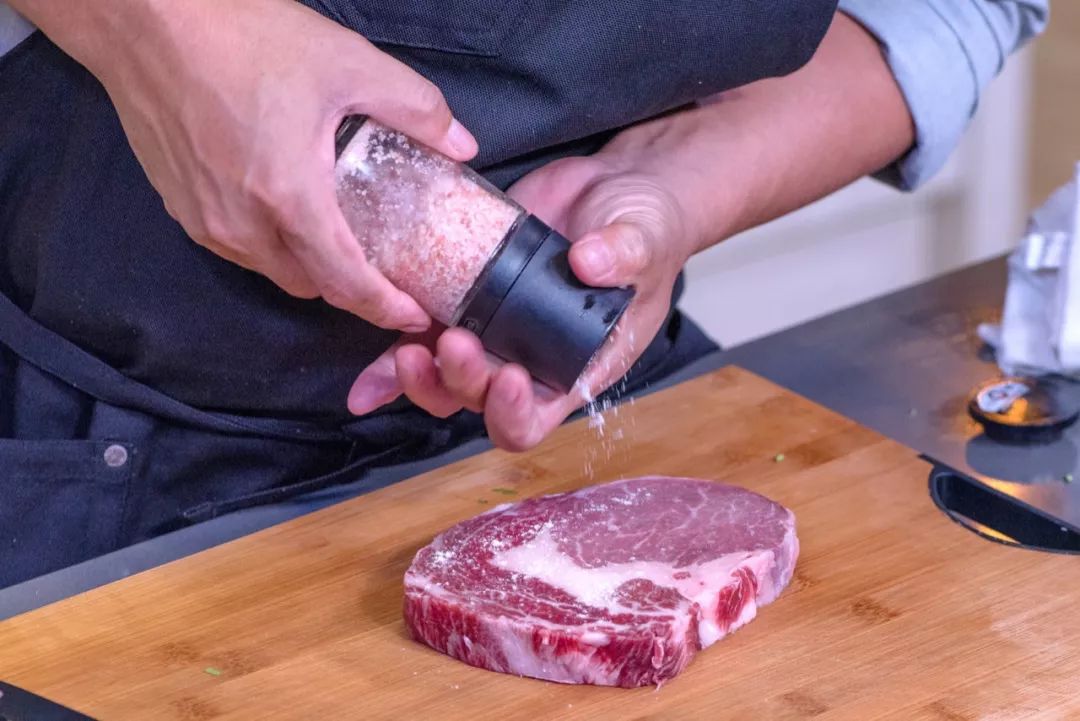 牛排两面都撒上盐,用厨房纸包住吸水。