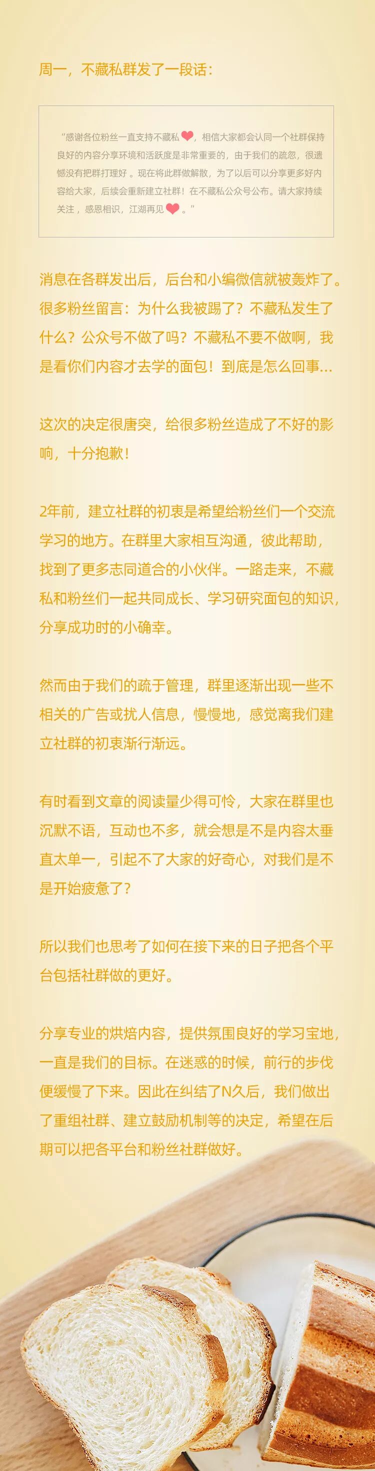 - 致:亲爱的不藏私粉丝们 文章约2000字,阅读时间约3分钟,是不藏私团队对大家的心底话,希望你们能耐心看完!比心~❤ 不藏私新社群入群操作👇🏻 不藏私社群已经重新创建好了!各位爱美食爱面包,喜