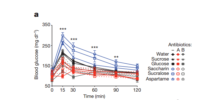 ▲ 蓝色为3组喝代糖水的老鼠的血糖.参考资料[2]