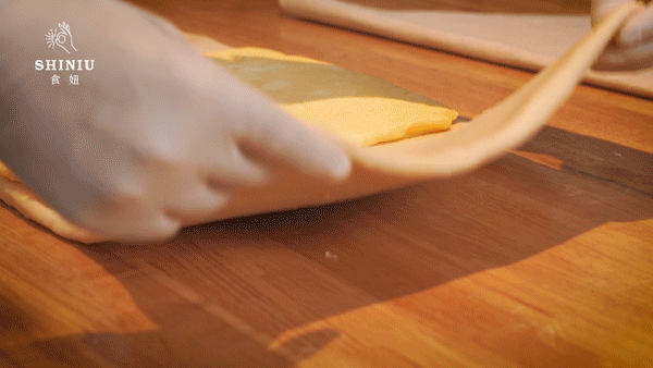 将黄油裹进面团内,经过三次三叠的折叠,烤出27层蜂窝内里,让27层每一层都布满香甜的黄油。严格按23℃进行操作,只为防止黄油融化混酥。