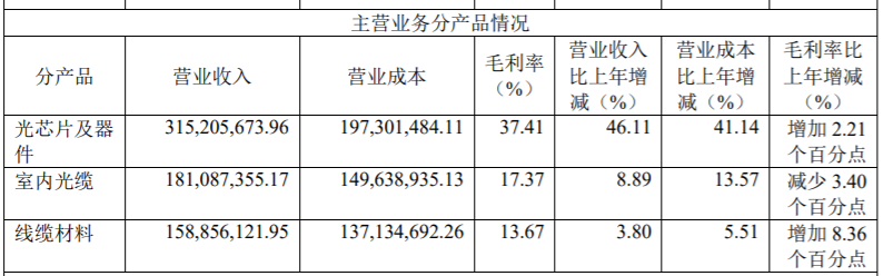 公司在光芯片及器件产品方面的持续投入逐步取得成效,在AWG芯片系列产品、DFB激光器芯片系列产品、光纤连接器等产品的推动下,公司光芯片及器件业务收入呈快速增长态势,2020年度光芯片及器件产品收入31,520.57万元,同比2019年增长46.11%,增幅明显。同时,室内光缆及线缆材料业务也克服了疫情的不利影响,保持小幅增长,其中,室内光缆产品收入18,108.74万元,同比 2019 年增长 8.89%;线缆材料产品收入 15,885.61 万元,同比 2019 年增长 3.80%。报告期内,在全球接入网市场及数据中心建设需求持续加速的推动下,公司出口销售收入增长态势良好,公司境外收入17,367.57 万元,占总收入之比为 25.86%(上年同期出口收入9,097.26 万元,占总收入的16.65%),同比增长 90.91%。