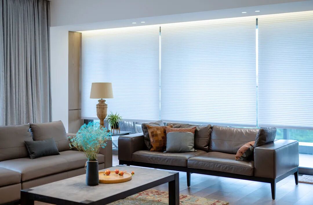 客餐厅全落地窗设计,绝佳的采光与视野,比别墅还敞亮大气。不仅可以轻松领略到窗外的自然美景,还可以增添居家生活情调。沙发背面以浅灰色遮光帘搭配白色窗帘纱,阳台面则以百叶纱帘,保证室内采光又兼顾了私密性。